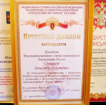 Председатель НСНБР А.Г.Огнивцев был награжден Почетной грамотой УФСКН России по городу Москве по итогам работы против наркотиков 2007-2008гг. "За большой вклад в дело борьбы с наркоманией и пропаганду здорового образа жизни." А.Г.Огнивцева представил к награждению начальник Службы по САО УФСКН России по городу Москве полковник полиции А.С.Асосков по ходатайству старшего оперуполномоченного по особо важным делам майора полиции А.А.Глахова. Почетную грамоту подписал начальник УФСКН России по городу Москве генерал-лейтенант полиции В.Л.Хворостян. Подробнее...